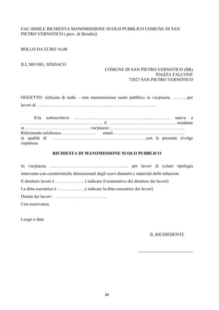 Lettera - richiesta spostamento pali enel - ADUC - Sosonline Feb 27, 2019 ... Con l'operatore avevamo concordato le modalità di spostamento e per evitare problemi ci eravamo verbalmente fatti carico delle opere di scavo ... Fac Simile Richiesta Spostamento dei Cavi Enel - Documenti Utili Nov 27, 2022 ... Non sempre, in queste situazioni, è facile capire come comportarsi. È possibile fare una richiesta di spostamento cavi Enel? E se sì, quando? Fac simile richiesta spostamento contatore - impresafutura Sep 18, 2020 ... modulo richiesta spostamento palo enel ... intestato a Comune di Chieti- Proventi Acquedotto e copia di un documento di