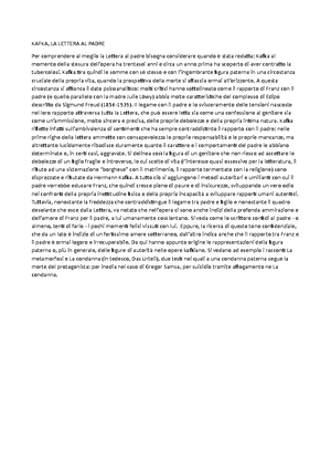 PDF lettera al padre - Salotto Conti lettera al padre Carissimo padre, di recente mi hai domandato perché mai sostengo di avere paura di te. Come al solito, non ho saputo risponderti niente, in parte proprio per la paura che ho di te, in parte perché questa paura si fonda su una quantità tale di dettagli che parlando non saprei coordinarli neppure passabilmente. Frasi di Lettera al padre, Frasi Libro - Frasi Celebri .it Tutte le più belle frasi del libro Lettera al padre dall'archivio di Frasi Celebri .it . Seguici su. Registrati / Accedi. Attiva/disattiva navigazione. User area. Toggle search bar Citazioni e aforismi Frasi d'amore Frasi film ... Franz Kafka [Tag:conflitti, padre]